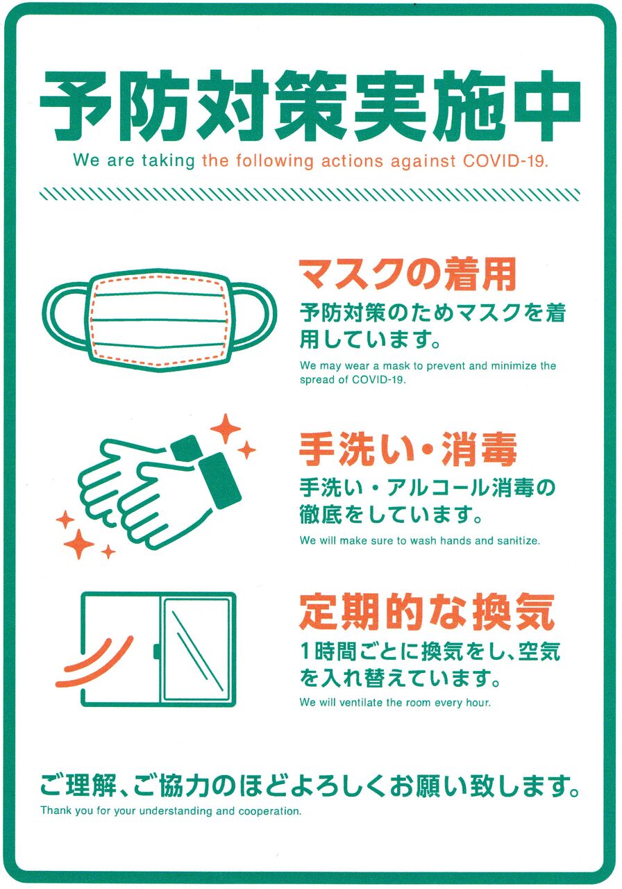 このたびの新型コロナウィルス[COVID-19]発生にともない徹底した対策を実施中です。